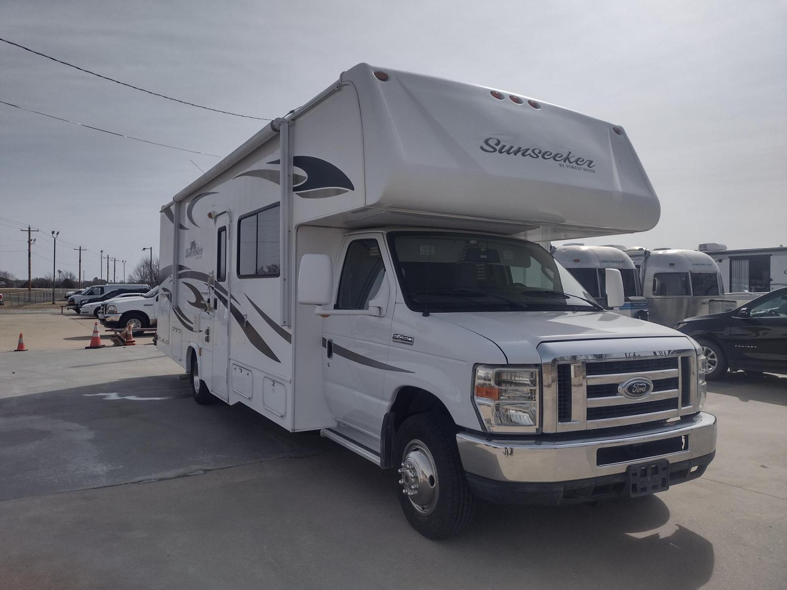 SPRING TIME IS HERE WHAT BETTER WAY TO START YOUR TRAVELS IN THIS 2012 FORD E450 2WD FOREST RIVER SUNSEEKER 2860DS CLASS C MOTORHOME 30FT OVERALL. IT FEATURES THE TRITON 6.8L V10 ENGINE, KEYLESS ENTRY, CLOTH MANUAL SEATS, POWER WINDOWS, POWER LOCKS, POWER MIRRORS, CRUISE CONTROL, TOW HAUL MODE, BACKUP CAMERA, AM/FM RADIO, SIRIUS RADIO, CD PLAYER, AUXILIARY PORT, AND USB PORT. IN THE LIVING AND KITCHEN AREA IS BOOTH STYLE DINETTE WITH SEAT BELTS THAT FOLDS DOWN FOR ADDITIONAL SLEEPING, OVERHEAD CABINETS, COUCH WITH SEAT BELTS THAT FOLD DOWN FOR ADDITIONAL SLEEPING, OVERHEAD CABINETS, OVERHEAD ENTERTAINMENT CENTER WITH TOSHIBA TV, 3 BURNER STOVE WITH OVEN, OVERHEAD MICROWAVE, DOUBLE STAINLESS STEEL SINK, FLIP UP COUNTER TOP, CABINET, 2 PULLOUT DRAWERS, OVERHEAD CABINETS, MID-SIZE FRIDGE, OVERHEAD CABINET, AND PANTRY. IN THE BATHROOM IS A VANITY SINK WITH MEDICINE CABINET, LINEN CABINET, PULL OUT DRAWER, AND STANDING SHOWER. IN THE BEDROOM IS A QUEEN SIZE BED WITH STORAGE UNDER THE BED, 2 WARDROBE CLOSETS, LINEN CABINET, PULL OUT DRAWERS, MIRROR ON THE WALL, AND PHILLIPS TV.